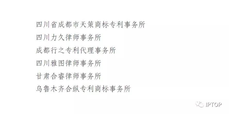 北京知产宝网络科技发展有限公司 北京知识产权运营管理有限公司 北京集慧智佳知识产权管理咨询股份有限公司 北京林达刘知识产权代理事务所(普通合伙) 中国商标专利事务所有限公司 中宇恒泰(北京)地理标志科技有限公司 九州海原科技(北京)有限公司 天津市北洋有限责任专利代理事务所 天津市天元生产力促进有限公司 石家庄众志华清知识产权事务所(特殊普通合伙) 河北国维知识产权咨询有限公司 太原晋科知识产权代理事务所(特殊普通合伙) 沈阳科苑专利商标代理有限公司 长春吉大专利代理有限责任公司 吉林新发知识产权服务有限公司 哈尔滨龙科专利代理有限公司 哈尔滨市伟晨专利代理事务所(普通合伙) 上海市协力律师事务所 上海晨皓知识产权代理事务所(普通合伙) 上海容智知识产权代理有限公司 上海弼兴律师事务所 上海硕力知识产权代理事务所(普通合伙) 南京苏高专利商标事务所(普通合伙) 江苏畅远信息科技有限公司 苏州创元专利商标事务所有限公司 苏州独墅湖科教发展有限公司 杭州天勤知识产权代理有限公司 杭州千克知识产权代理有限公司 合肥市长远专利代理事务所(普通合伙) 合肥智慧龙图腾知识产权股份有限公司 芜湖安汇知识产权代理有限公司 安徽浩智信知识产权代理有限公司 厦门市新华专利商标代理有限公司 江西省子轩科技有限公司 江西清能高科技术有限公司 济南诚智商标专利事务所有限公司 青岛橡胶谷知识产权有限公司 青岛华慧泽知识产权代理有限公司 河南省亿通知识产权服务有限公司 武汉科皓知识产权代理事务所(特殊普通合伙) 长沙朕扬知识产权代理事务所(普通合伙) 东莞市华南专利商标事务所有限公司 广州新诺专利商标事务所有限公司 深圳市中兴达知识产权运营有限公司 广西南宁新创之友知识产权代理有限公司 海口汉普知识产权代理有限公司 重庆强大凯创专利代理事务所(普通合伙) 超凡知识产权服务股份有限公司 四川睿道知识产权服务有限公司 行之知识产权服务集团有限公司 遵义强大博信知识产权服务有限公司 贵阳东圣专利商标事务有限公司 云南滇创科技孵化器企业管理有限公司 陕西丰瑞律师事务所 新疆知信科技有限公司