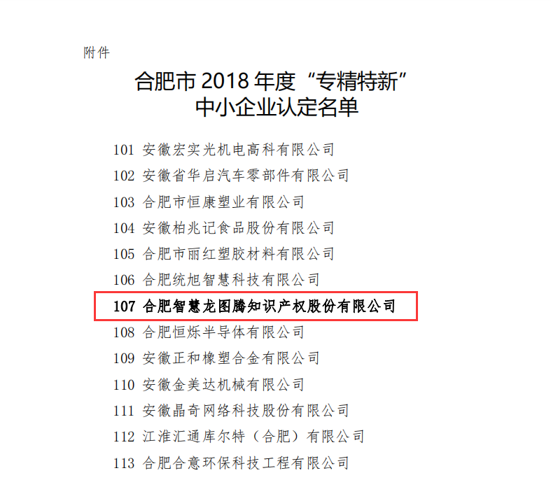 2019年2月27日,合肥市2018年度“专精特新”中小企业认定名单公示,合肥智慧龙图腾知识产权股份有限公司获此殊荣。
