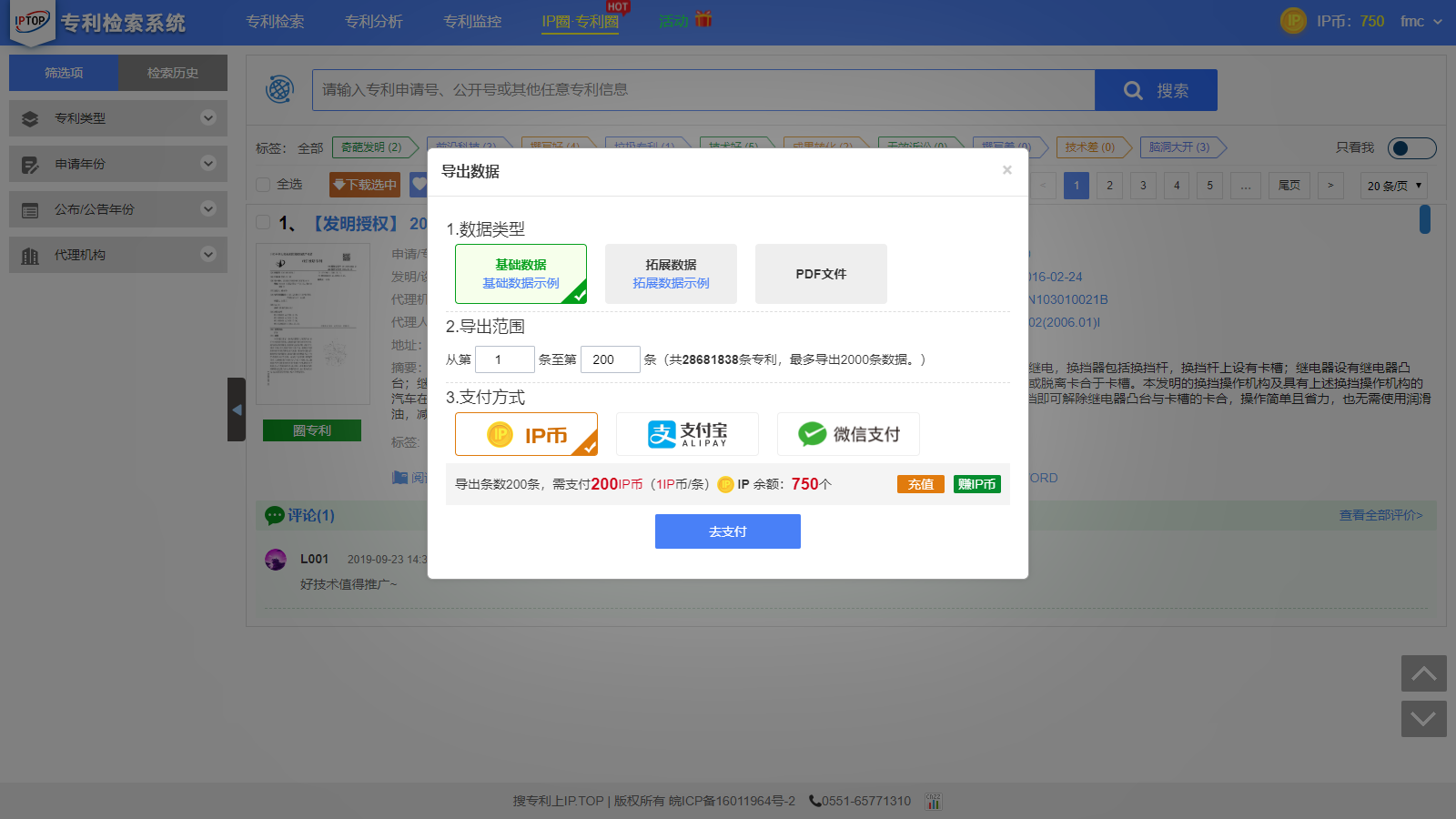 2.在IP圈·专利圈中,点击“导出数据”按钮,出现如下图界面,即可选择数据类型(基础数据、拓展数据、pdf文件)、自定义导出范围,首选IP币支付,完成支付后即可根据页面提示前往订单中下载。操作简单、数据全面,关键是一条基础数据才1个IP币,便宜到爆!!!!!!!!!