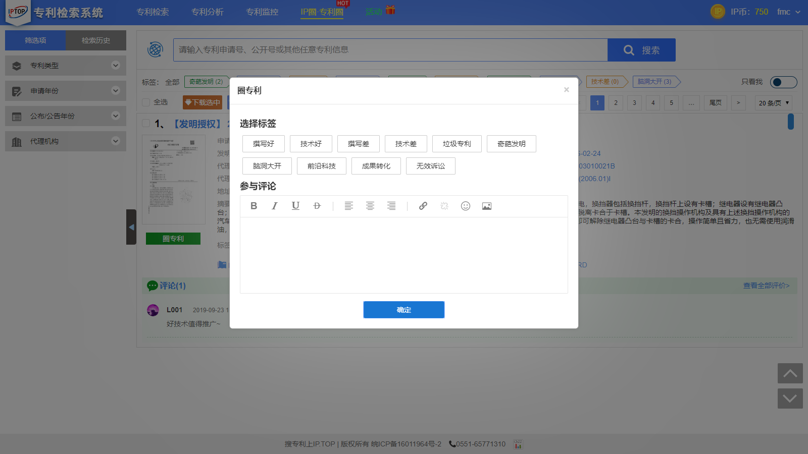 IPTOP专利检索系统中进入“IP圈·专利圈”,点击“圈专利”按钮,进入如下图所示界面,即可给专利贴标签,写评论~  圈专利不仅可以获得IP币,更重要的是能集思广益,让价值度高的专利被更多人了解、熟知~