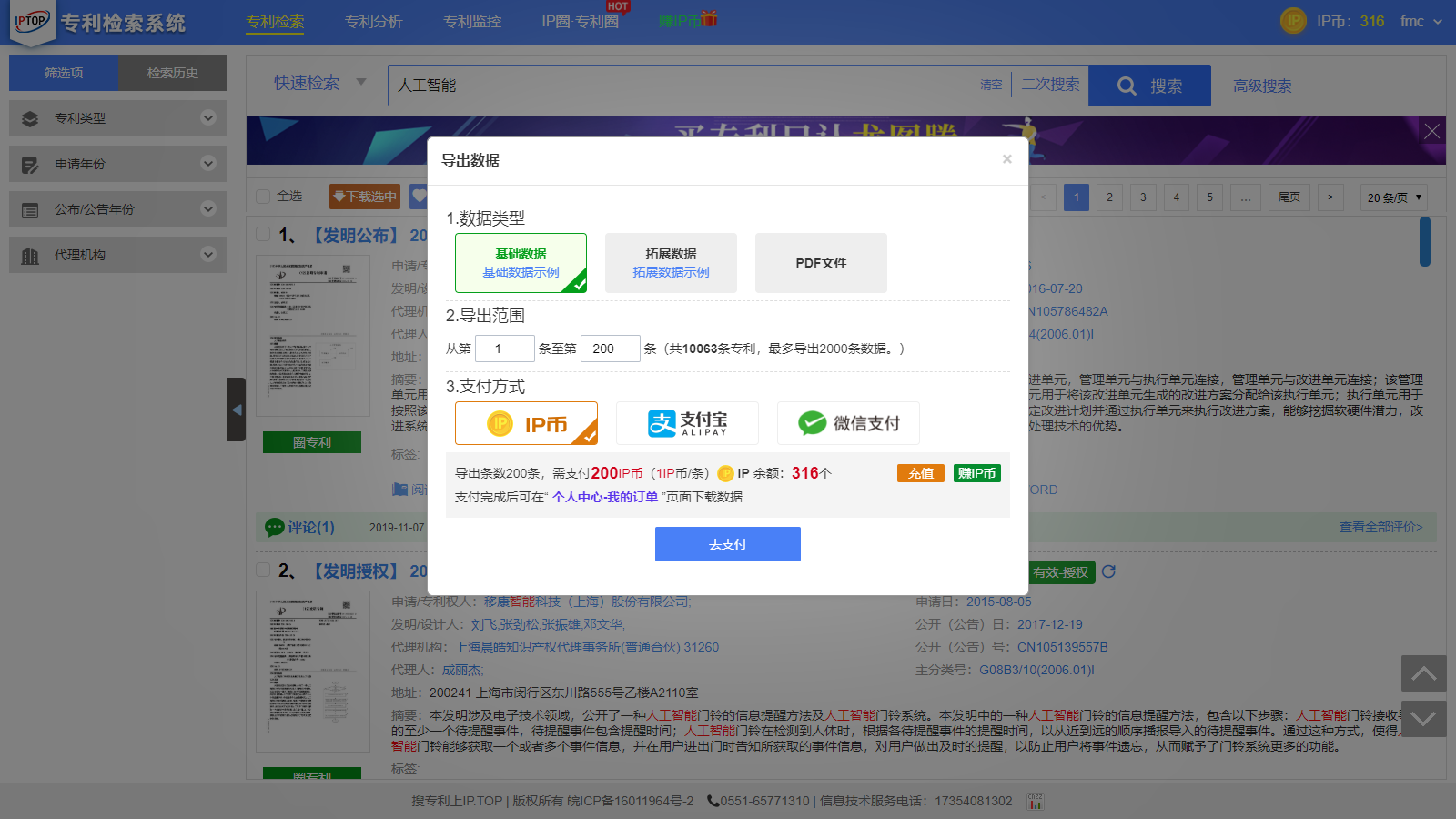 如上图所示,用户可选择下载的数据类型,包含基础数据、拓展数据、PDF文件;自定义导出范围、选择支付方式(默认用平台IP币支付),点击“去支付”按钮,支付成功后,根据平台界面提示,即可进入个人中心订单界面中下载数据~
