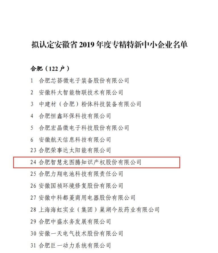 合肥智慧龙图腾知识产权股份有限公司被认定为 安徽省专精特新中小企业公示文件