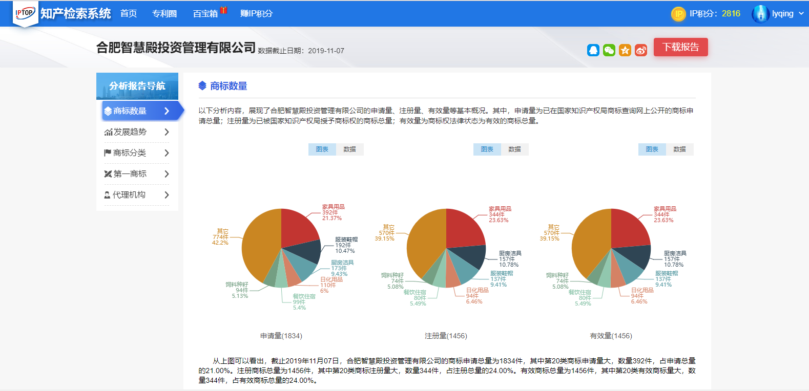 二、综合全面的商标分析报告、商标查新 IPTOP系统不仅有专利分析报告,还有商标分析报告。分析报告好处: 1. 企业品牌宣传推广,提升市场竞争力 2. 增加无形资产,提高市场价值 3. 增强客户对产品的信息,快速了解商标即是品牌 4. 品牌保护盾牌,防止他人冒名盗用