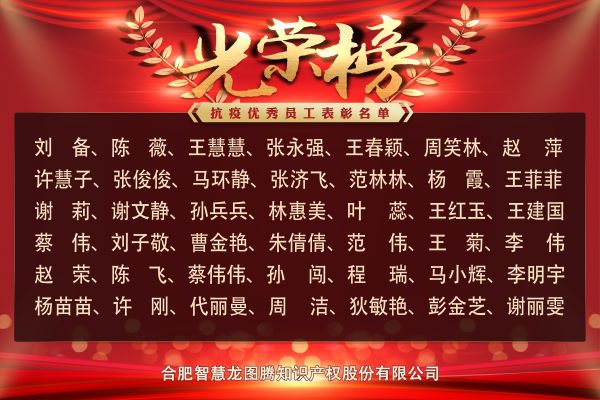 在授予以上员工“抗疫优秀员工”称号的同时,公司也准备了丰厚的奖品,感谢他们对龙图腾的付出! 合肥智慧龙图腾知识产权股份有限公司 二0二0年四月二十八日