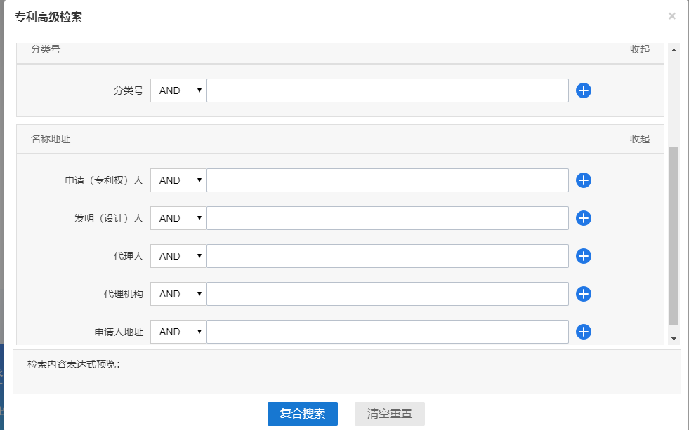 下拉滚动条,可以进一步的看到更多的界面,具体如下: 我们可以看出,专利高级检索里面包括了关键词检索、日期检索、号码检索、分类号检索以及名称地址检索,可以说是非常齐全了,能够满足专利行业的所有检索需求。