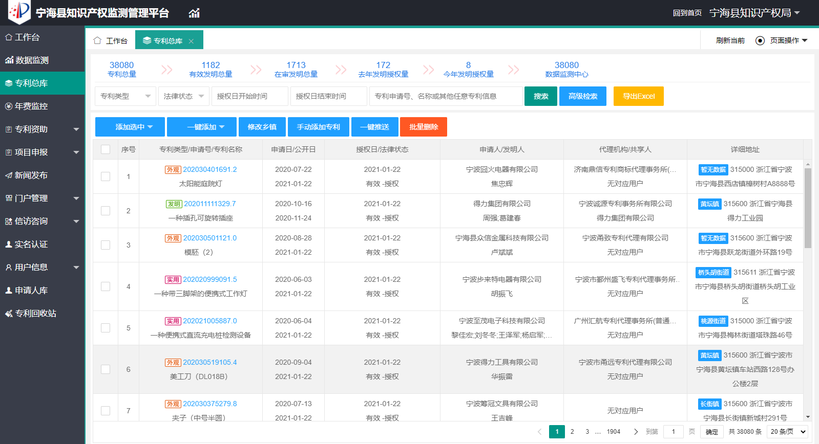 二、专利库 专利库包含本区域的所有专利数据,方便快捷管理,有效统计各种类型专利数据,可以将专利直接推送给对应申请人,大大提高专利管理效率。
