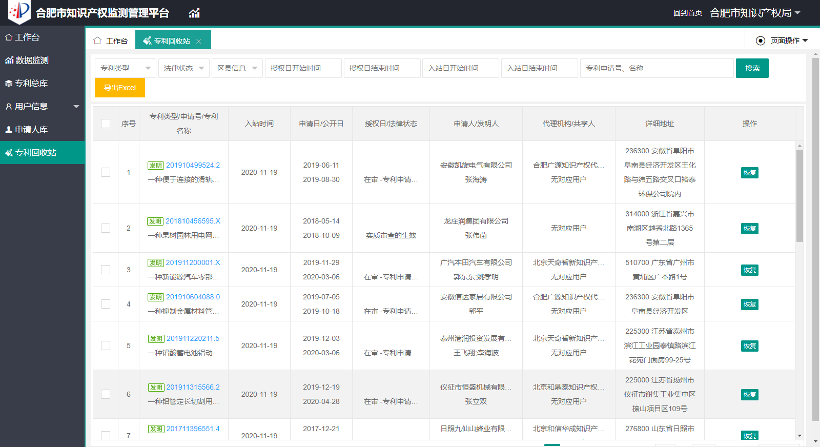 四、回收站 回收站主要用于管理用户转移出来的专利,可以一键恢复专利至专利库。对于转移的专利数据,有记录可查找。