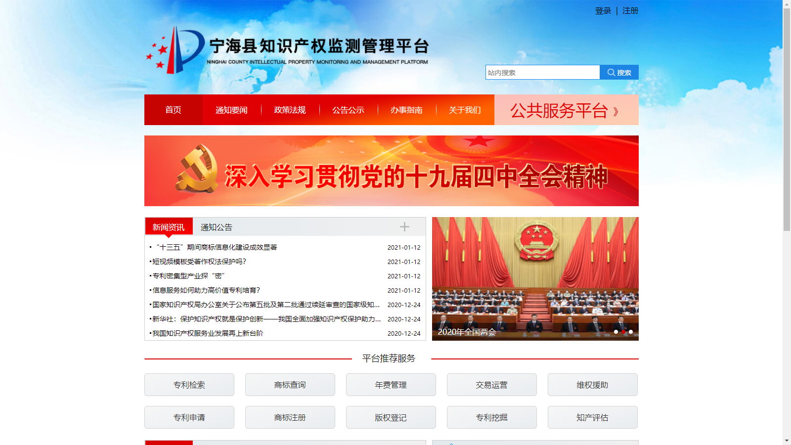 买专利卖专利找龙图腾,真高效! 查专利查商标用IPTOP,全免费!专利年费监控用IP管家,真方便! 2020年龙图腾分别完成了象山县政务服务平台、宁海县政务服务平台、合肥市政务服务平台。政务服务平台五大优势特点,一:区域专利地图,专利状况一目了然;二:独立的专利库,方便快捷管理本区域专利数据;三:申请人库,直接查看管理本区域申请人;四:回收站,管理转移出本地的专利;五:新闻门户管理,发布新闻,宣传区域政策。更多功能尽在政务服务平台,赶紧加入体验吧!