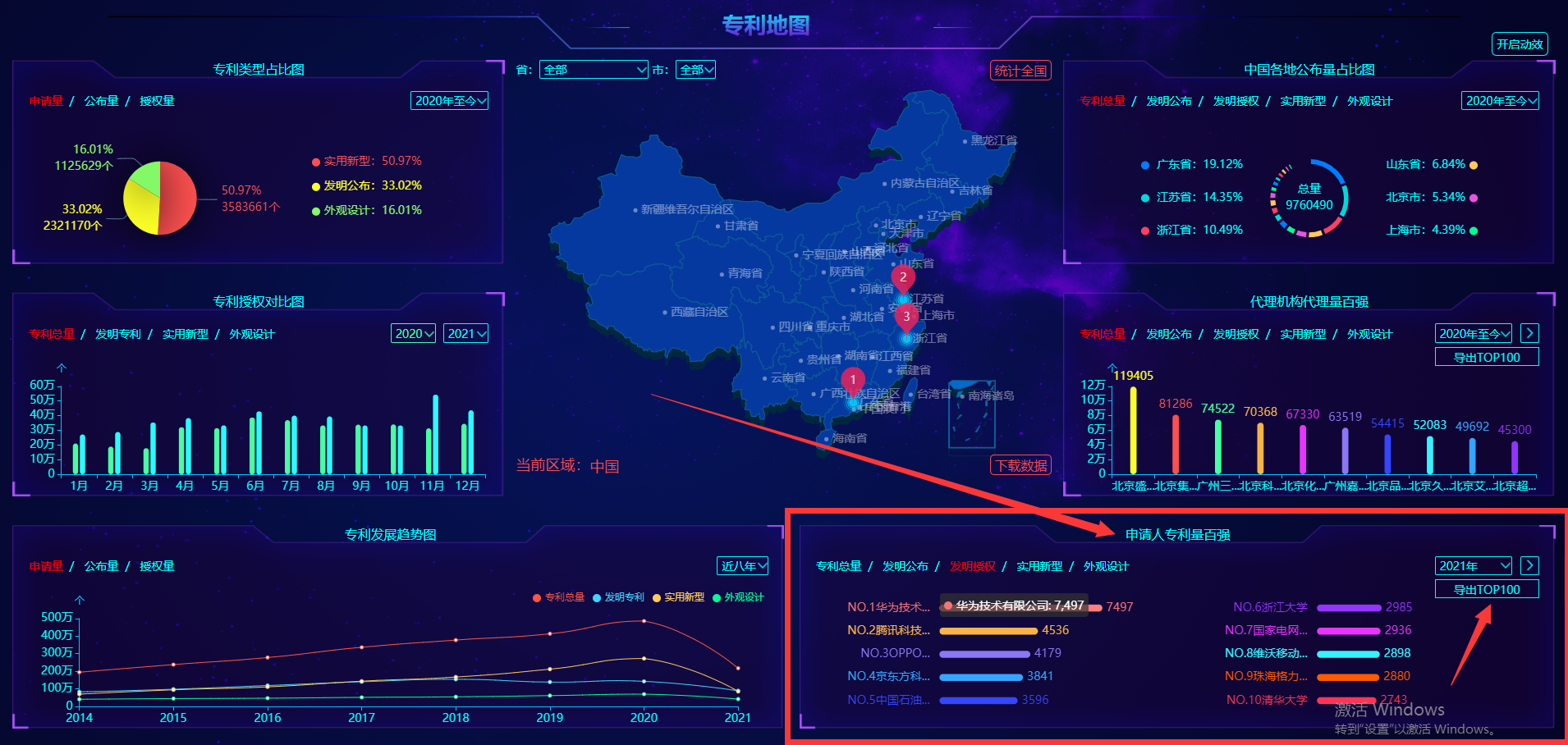 买专利卖专利找龙图腾,真高效! 查专利查商标用IPTOP,全免费!专利年费监控用IP管家,真方便! 2021年中国发明专利授权量排名出炉啦!通过IPTOP知识产权平台的专利地图栏目获取到,2021年排名前10的专利权利人依次为华为技术有限公司、腾讯科技(深圳)有限公司、OPPO广东移动通信有限公司、京东方科技集团股份有限公司、中国石油化工股份有限公司、浙江大学、国家电网有限公司、维沃移动通信有限公司、珠海格力电器股份有限公司、清华大学。其中,华为再次霸占榜首;与2020年相比,仅有维沃移动通信有限公司一家取代了西安交通大学进入前10强,其他9名仅部分发生了名次变化。进入前10强的门槛从2499件提高到了2743件;进入前100强的门槛从540件提高到了722件。具体细节请见下表。