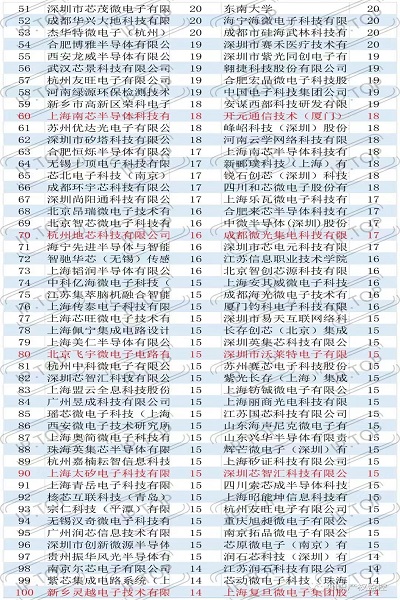 四、权利人排名 截止至2021年12月31日,通过龙图腾IPTOP知识产权平台的集成电路栏目进行数据分析得到:累计发证量排名前五的权利人依次为:1、美国亚德诺半导体公司943件,2、上海艾为电子技术股份有限公司445件,3、深圳市明微电子股份有限公司282件、4、上海复旦微电子集团股份有限公司248件,5、上海贝岭股份有限公司246件;其中第1名美国公司的登记量接近第2-4名我国公司的总和,可见我国集成电路实力较发达国家仍有很大差距;前100名的发证数据如下图所示。