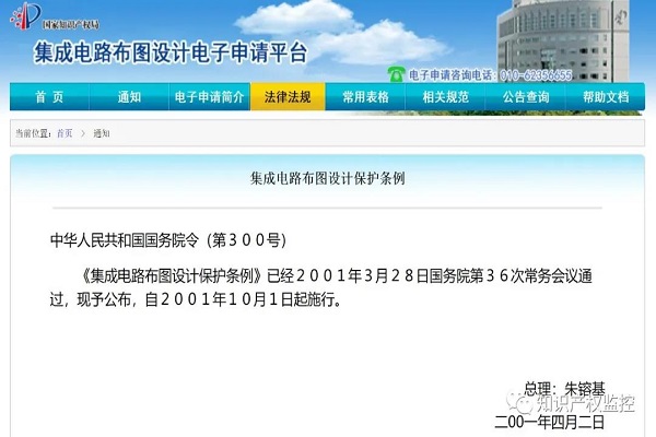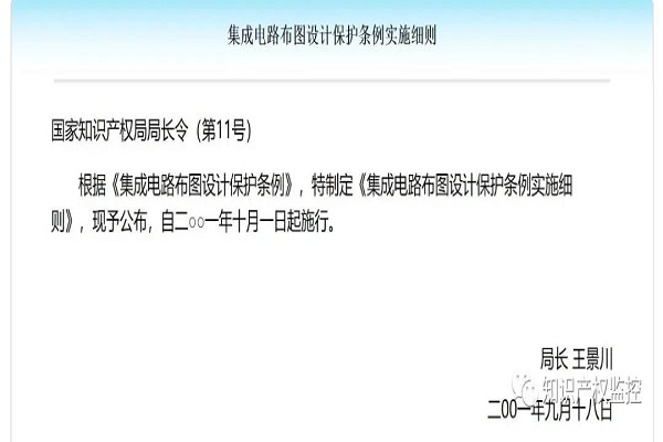 五、立法情况 我国《集成电路布图设计保护条例》于2001年3月28日国务院第36次常务会议通过,自2001年10月1日起施行。根据《集成电路布图设计保护条例》制定的《集成电路布图设计保护条例实施细则》,自2001年10月1日起施行。根据《集成电路布图设计保护条例》,制定的《集成电路布图设计行政执法办法》,现予以公布。《集成电路布图设计行政执法办法》自2001年11月28日起施行。