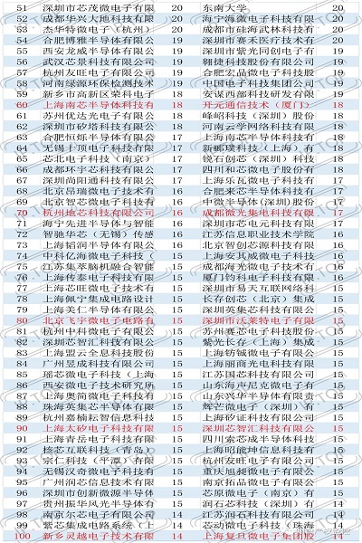 买专利卖专利找龙图腾,真高效! 查专利查商标用IPTOP,全免费!专利年费监控用IP管家,真方便! 2021年集成电路布图设计授权排名出炉啦!通过龙图腾IPTOP知识产权平台的集成电路栏目进行数据分析得到:2021年累计授权集成电路布图设计为13390件,较2020年累计授权的11727件增长较少。2021年排名前10的权利人依次为:1、上海艾为电子技术股份有限公司,2、广州振芯半导体科技有限公司,3、苏州贝克微电子有限公司,4、广州米兔芯片设计服务有限公司,5、广州云智慧信息技术有限公司,6、普芯达电子香港有限公司,7、上海芯龙半导体技术股份有限公司,8、美国亚德诺半导体公司,9、无锡中微爱芯电子有限公司,10、浙江台谊消防设备有限公司,与2020年相比,仅上海艾为电子技术股份有限公司维持了第1名,其他名次均发生了较大变化,第1名授权数量从228件下降到122件,下降超过了50%,进入前10的门槛从37件增长到55件,进入前100名的门槛未发生变化,仍为14件。 前100名的授权数据具体如下图所示。